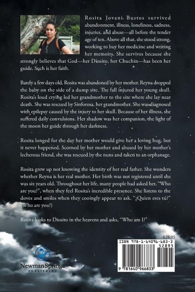 Rosita Jovani Bustos survived abandonment, illness, loneliness, sadness, injuries, and abuse-all before the tender age of ten. Above all that, she stood strong, working to buy her medicine and writing her memoirs. She survives because she strongly believes that God-her Diosito, her Chuchin-has been her guide. Such is her faith. Barely a few days old, Rosita was abandoned by her mother. Reyna dropped the baby on the side of a dump site. The fall injured her young skull. Rosita's loud crying led her grandmother to the site where she lay near death. She was rescued by Sinforosa, her grandmother. She was diagnosed with epilepsy caused by the injury to her skull. Because of her illness, she suffered daily convulsions. Her shadow was her companion, the light of the moon her guide through her darkness. Rosita longed for the day her mother would give her a loving hug, but it never happened. Scorned by her mother and abused by her mother's lecherous friend, she was rescued by the nuns and taken to an orphanage. Rosita grew up not knowing the identity of her real father. She wonders whether Reyna is her real mother. Her birth was not registered until she was six years old. Throughout her life, many people had asked her, "Who are you?", when they feel Rosita's incredible presence. She listens to the doves and smiles when they cooingly appear to ask, "¿Quien eres tú?" (Who are you?) Rosita looks to Diosito in the heavens and asks, "Who am I?"