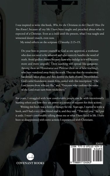 I was inspired to write this book, Who Are the Christians in the Church? How Do You Know?, because all my life I have been taught and preached about what is expected of a Christian. Even as a child until the present, what I was taught and witnessed doesn't match, even now. My mind reflects on the scripture 2 Timothy 2:15-19, Do your best to present yourself to God as one approved, a workman who does not need to be ashamed and who correctly handles the word of truth. Avoid godless chatter, because those who indulge in it will become more and more ungodly. Their teaching will spread like gangrene. Among them are Hymenaeus and Philetus (their sin of false teaching), who have wandered away from the truth. They say that the resurrection has already taken place, and they destroy the faith of some. Nevertheless, God's solid foundation stands firm, sealed with this inscription: "The Lord knows those who are His," and, "Everyone who confesses the name of the Lord must turn from wickedness." For years, I struggled with how comfortable people can be with intentionally hurting others and how they use power as a source of support for their actions. Writing this book was a form of therapy for me. Years ago, I started to write a book, and I had a very close friend read it, and they said, "This isn't you." So I put it aside. I wasn't comfortable talking about me or what I have faced in life. I have been so disappointed with some actions I experienced with Christians.
