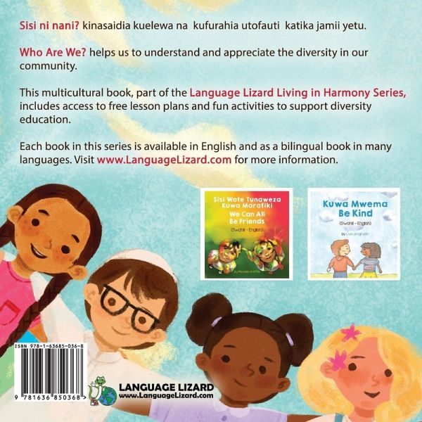 "Beautiful messages within inspiring art!" - Zeynep E., Language Acquisition Specialist Who Are We? helps us to understand and appreciate the diversity in our community. This multicultural book, part of the Language Lizard Living in Harmony Series, includes access to free lesson plans and fun activities to support diversity education. This book is available in English-only and in many bilingual editions. The other books in the Language Lizard Living in Harmony Series are:Be Kind by Livia Lemgruber We Can All Be Friends by Michelle Griffis