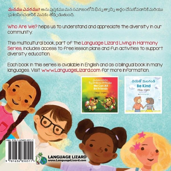 "Beautiful messages within inspiring art!" - Zeynep E., Language Acquisition Specialist Who Are We? helps us to understand and appreciate the diversity in our community. This multicultural book, part of the Language Lizard Living in Harmony Series, includes access to free lesson plans and fun activities to support diversity education. This book is available in English-only and in many bilingual editions. The other books in the Language Lizard Living in Harmony Series are:Be Kind by Livia Lemgruber We Can All Be Friends by Michelle Griffis