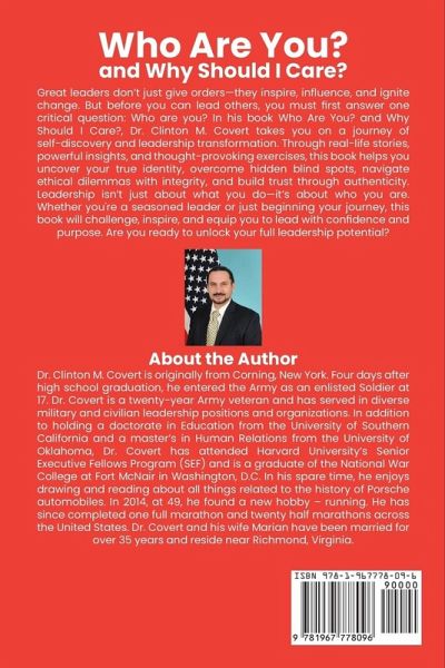 Great leaders don't just give orders-they inspire, influence, and ignite change. But before you can lead others, you must first answer one critical question: Who are you? In his book Who Are You? And Why Should I Care? Dr. Clinton M. Covert takes you on a journey of self-discovery and leadership transformation. Through real-life stories, powerful insights, and thought-provoking exercises, this book helps you uncover your true identity, overcome hidden blind spots, navigate ethical dilemmas with integrity, and build trust through authenticity. Leadership isn't just about what you do-it's about who you are. Whether you're a seasoned leader or just beginning your journey, this book will challenge, inspire, and equip you to lead with confidence and purpose. Are you ready to unlock your full leadership potential?