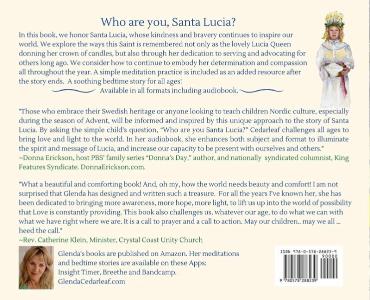 Glenda Cedarleaf is an author, therapist and guided imagery meditation practitioner. She loves helping people use the power of imagery and mindfulness meditation for inspiration and healing. Glenda received her Masters of Social Work in 1980. She has been a therapist in two integrative healing centers and has had a private practice for over 30 years offering sessions worldwide.Glenda was inspired to write this young reader's picture book after creating an initial version for her granddaughters to teach them about their Swedish heritage and share the legacy of Santa Lucia. She now expands her intention for this book to highlight Santa Lucia as a role model; especially for empowering girls to be a force for good in this world. The reader learns not only about the beauty of the Lucia Queen celebration that takes place each December in Sweden and many other countries, but also about this saint's qualities of courage and compassion.To deepen this experience, readers can take a guided meditation journey, one which is relevant for beginners as well as experienced meditators. The audiobook experience enhances both the reading of each page as well as the the guided meditative.