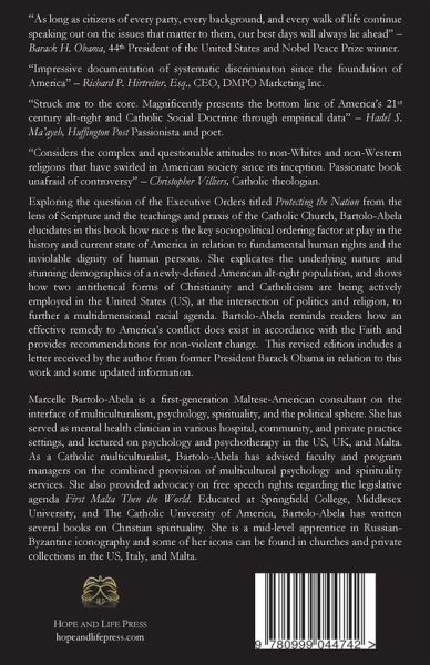 Exploring the question of the Executive Orders titled Protecting the Nation from the lens of Scripture and the teachings and praxis of the Catholic Church, Bartolo-Abela elucidates in this book how race is the key sociopolitical ordering factor at play in the history and current state of America in relation to fundamental human rights and the inviolable dignity of human persons. She explicates the underlying nature and stunning demographics of a newly-defined American alt-right population, and shows how two antithetical forms of Christianity and Catholicism are being actively employed in the United States (US), at the intersection of politics and religion, to further a multidimensional racial agenda. Bartolo-Abela reminds readers how an effective remedy to America’s conflict does exist in accordance with the Faith and provides recommendations for non-violent change. This revised edition includes a letter received by the author from former President Barack Obama in relation to this work and some updated information.