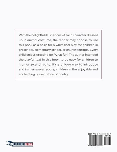 With the delightful illustrations of each character dressed up in animal costume, the reader may choose to use this book as a basis for a whimsical play for children in preschool, elementary school, or church settings. Every child enjoys dressing up. What fun! The author intended the playful text in this book to be easy for children to memorize and recite. It's a unique way to introduce and immerse even young children in the enjoyable and enchanting presentation of poetry.