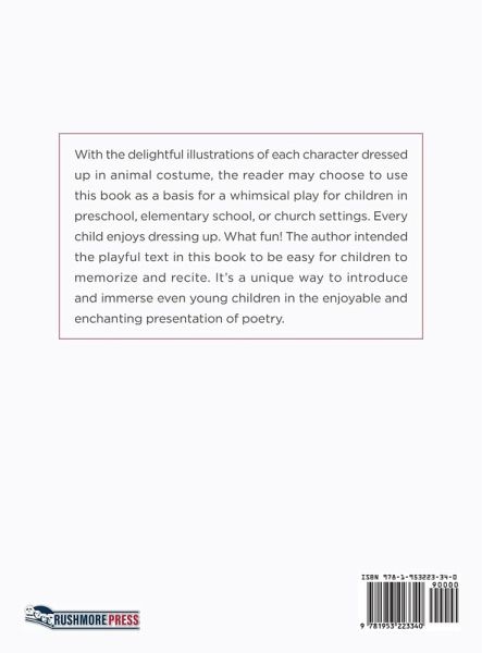 With the delightful illustrations of each character dressed up in animal costume, the reader may choose to use this book as a basis for a whimsical play for children in preschool, elementary school, or church settings. Every child enjoys dressing up. What fun! The author intended the playful text in this book to be easy for children to memorize and recite. It's a unique way to introduce and immerse even young children in the enjoyable and enchanting presentation of poetry.