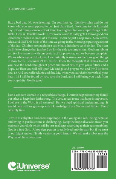 Had a bad day. No one listening. On your last leg. Identity stolen and do not know who you are supposed to be. Just plain tired. Welcome to this little girl day. Good things someone took time to enlighten her on simple things in the Bible. Here is Danielle's world. How worse could this day get? Or how good can it become? When in need of a miracle. It can be just a nap away. Slow down, relax, and LISTEN! Most of the time we get up in the morning expecting a repeat of the day. Children are caught in a cycle that adults have set their day. They can do little to change that just hold on for the ride to completion. God can reboot us. Yes, He renew us with one gesture of his presence, and we become complete. We are whole again in his Love. He constantly reassures us there are good things in store for us. Jeremiah 29:11- 14 For I know the thoughts that I think toward you, says the Lord, thoughts of peace and not of evil, to give you a future and a hope. 12 Then you will call upon Me and go and pray to Me, and I will listen to you. 13 And you will seek Me and find Me, when you search for Me with all your heart. 14 I will be found by you, says the Lord, and I will bring you back from your captivity; God is good.