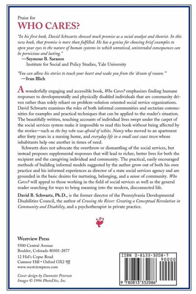 A wonderfully engaging and accessible book, Who Cares? emphasizes finding humane responses to developmentally and physically disabled individuals that are community driven rather than solely reliant on problem-solution oriented social service organizations. David Schwartz examines the roles of both informal communities and sectarian communities for examples and practical techniques that can be applied to the reader's situation. The beautifully written, touching accounts of individual lives swept under the carpet of the social services system make it impossible to read this book without being affected by the stories?such as the boy who was afraid of white,Nancy who moved to an apartment after forty years in a nursing home, and everyday life in a small east coast town whose inhabitants help one another in times of need.Schwartz does not advocate the overthrow or dismantling of the social services, but instead proposes supplemental responses that will lead to richer, better lives for both the recipient and the caregiving individual and community. The practical, easily encouraged methods of building informal models suggested by the author grow out of both his own practice and his informed experiences as director of a state social services agency and are grounded in the basic desires for nurturing, belonging, and a sense of community. Who Cares? will appeal to those working in the field of social services as well as the general reader searching for ways to bring meaning into the modern, disconnected life.