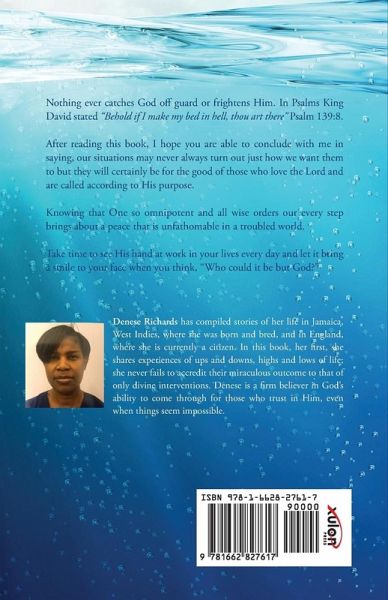 Nothing ever catches God off guard or frightens Him. In Psalms King David stated "Behold if I make my bed in hell, thou art there" Psalm 139:8. After reading this book, I hope you are able to conclude with me in saying, our situations may never always turn out just how we want them to but they will certainly be for the good of those who love the Lord and are called according to His purpose. Knowing that One so omnipotent and all wise orders our every step brings about a peace that is unfathomable in a troubled world. Take time to see His hand at work in your lives every day and let it bring a smile to your face when you think, "Who could it be but God?" Denese Richards has compiled stories of her life in Jamaica, West Indies, where she was born and bred, and in England, where she is currently a citizen. In this book, her first, she shares experiences of ups and downs, highs and lows of life; she never fails to accredit their miraculous outcome to that of only divine interventions. Denese is a firm believer in God's ability to come through for those who trust in Him, even when things seem impossible.