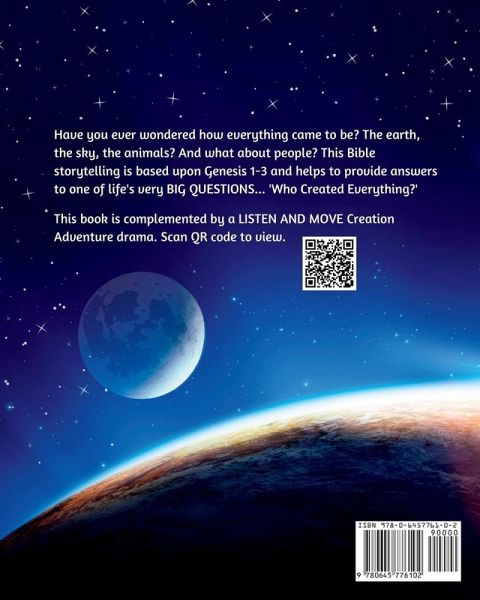 Have you ever wondered how everything came to be? The earth, the sky, the animals? And what about people? This storytelling is based upon the biblical genesis account and helps to provide answers to one of life's very big questions... 'Who Created Everything?' Author and teacher Susan Wright shares a biblical storytelling that is simple, accurate and memorable. Her use of repetition engages the children to be participants in the narrative throughout the reading. The large size realistic visuals adds another dimension for enjoying the biblical account of creation. It is sure to become a creation storybook that will be used by countless Sunday school teachers, parents and families. This book is complemented by the 'Listen & Move Creation Adventure' found on Youtube. It guides the children to use their imagination and bodies to act out the creation story. You can view this musical drama activity along with teacher tutorial on 'Wright Ideas with Susan' youtube channel.