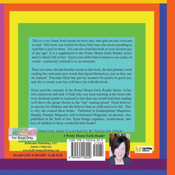 This is a very funny book meant for boys only, that girls are also welcome to read. This book was written for those little men who need something to read that is just for them. You can also read this book to your favorite guy of any age! It is a supplement to the Penny Mouse Early Reader series, and it's chock full of fun! Teach your child what it means to use a play on words-commonly referred to as an innuendo. There are some old and familiar words in this book, the first primary word reading list, and some new words that repeat themselves, just so they can be learned! Penelope Dyan has put her acumen for poetry to good use, and she is certain your boy will have fun with this book. Dyan used the concepts in the Penny Mouse Early Reader Series in her own classroom and took 15 kids (she was team teaching at the time) who were declared unable to read and in less than one month had them reading well above the group chosen as the "top" reading group! Dyan believes in success for children, and she believes that no child need ever fail. This is why she created these books. Published in Kindergartner Magazine, Humpty Dumpty Magazine, and in Instructor Magazine, an attorney also published in the field of law, Dyan brings all her expertise, her creativeness, and her love of children to these wonderful little books! "For Boys Only"® is a US registered trademark of Bellissima Publishing, LLC.