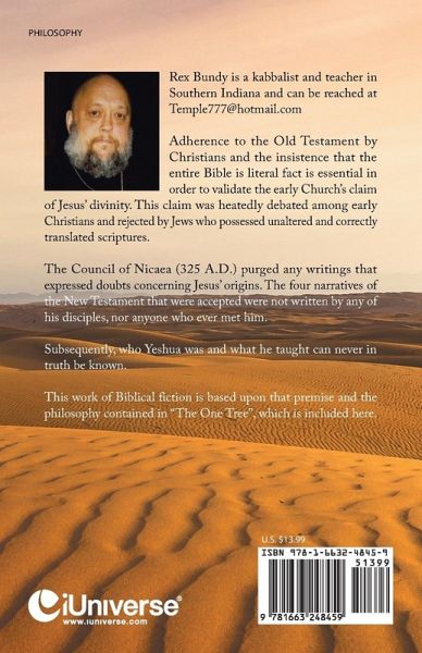 Rex Bundy is a kabbalist and teacher in Southern Indiana and can be reached at Temple777@hotmail.com Adherence to the Old Testament by Christians and the insistence that the entire Bible is literal fact is essential in order to validate the early Church's claim of Jesus' divinity. This claim was heatedly debated among early Christians and rejected by Jews who possessed unaltered and correctly translated scriptures. The Council of Nicaea (325 A.D.) purged any writings that expressed doubts concerning Jesus' origins. The four narratives of the New Testament that were accepted were not written by any of his disciples, nor anyone who ever met him. Subsequently, who Yeshua was and what he taught can never in truth be known. This work of Biblical fiction is based upon that premise and the philosophy contained in "The One Tree", which is included here.