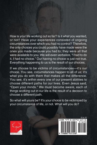 How is your life working out so far? Is it what you wanted, or not? Have your experiences consisted of ongoing circumstances over which you had no control? Therefore, the only choices you could possibly have made were the ones you made because you had to; they were all that were available to you. We will even verbalize, "I had to do it, I had no choice." Our having no choice is just not true. Everything happening to us is the result of our choices. If we choose to be victims of circumstances--it's our choice. You see, circumstances happen to all of us; it's what you do with them that makes all the difference. You see, it's within every one of our present abilities to choose different paths for our lives. Even Jesus said, "Open your minds." We must become aware, each of things working out in our life is the result of a decision to choose a different path. So what will yours be? It's your choice to be victimized by your circumstance of life, or not. What will you do?