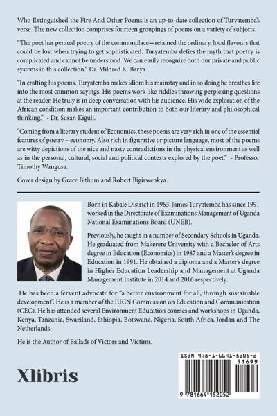 Who Extinguished the Fire And Other Poems is an up-to-date collection of Turyatemba's verse. The new collection comprises fourteen groupings of poems on a variety of subjects. "The poet has penned poetry of the commonplace-retained the ordinary, local flavours that could be lost when trying to get sophisticated. Turyatemba defies the myth that poetry is complicated and cannot be understood. We can easily recognize both our private and public systems in this collection." Dr. Mildred K. Barya. "In crafting his poems, Turyatemba makes idiom his mainstay and in so doing he breathes life into the most common sayings. His poems work like riddles throwing perplexing questions at the reader. He truly is in deep conversation with his audience. His wide exploration of the African condition makes an important contribution to both our literary and philosophical thinking." - Dr. Susan Kiguli. "Coming from a literary student of Economics, these poems are very rich in one of the essential features of poetry - economy. Also rich in figurative or picture language, most of the poems are witty depictions of the nice and nasty contradictions in the physical environment as well as in the personal, cultural, social and political contexts explored by the poet." - Professor Timothy Wangusa. Cover design by Grace Bithum and Robert Bigirwenkya.