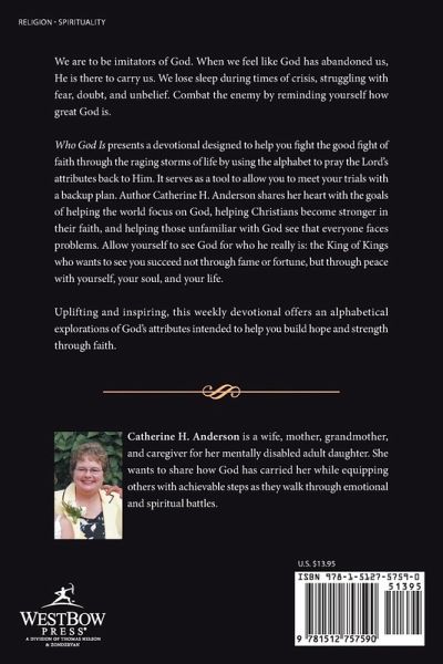 We are to be imitators of God. When we feel like God has abandoned us, He is there to carry us. We lose sleep during times of crisis, struggling with fear, doubt, and unbelief. Combat the enemy by reminding yourself how great God is. Who God Is presents a devotional designed to help you fight the good fight of faith through the raging storms of life by using the alphabet to pray the Lord's attributes back to Him. It serves as a tool to allow you to meet your trials with a backup plan. Author Catherine H. Anderson shares her heart with the goals of helping the world focus on God, helping Christians become stronger in their faith, and helping those unfamiliar with God see that everyone faces problems. Allow yourself to see God for who he really is: the King of Kings who wants to see you succeed not through fame or fortune, but through peace with yourself, your soul, and your life. Uplifting and inspiring, this weekly devotional offers an alphabetical explorations of God's attributes intended to help you build hope and strength through faith.