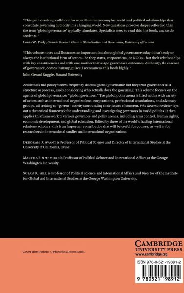 Most discussions of global governance treat it as a structure or process, without considering who does the governing. Who Governs the Globe? offers a theoretical framework for understanding these non-state governors and applies this framework to policy arenas including arms control, human rights, economic development and global education.