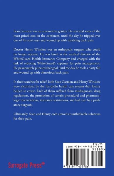 Sean Garmen was an automotive genius. He serviced some of the most prized cars on the continent, until the day he tripped over one of his son's toys and wound up with disabling back pain. Doctor Henry Winslow was an orthopedic surgeon who could no longer operate. He was hired as the medical director of the WhiteGuard Health Insurance Company and charged with the task of reducing WhiteGuard's expenses for pain management. He passionately pursued that goal until the day he took a nasty fall and wound up with obnoxious back pain. In their searches for relief, both Sean Garmen and Henry Winslow were victimized by the for-profit health care system that Henry helped to create. Each of them suffered from misdiagnoses, drug regulations, the promotion of certain procedural and pharmacologic interventions, insurance restrictions, and bad care by a predatory surgeon. Ultimately, Sean and Henry each arrived at unthinkable solutions for their pain.