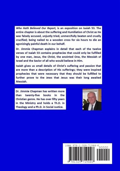Who Hath Believed Our Report, is an exposition on Isaiah 53. The entire chapter is about the suffering and Humiliation of Christ as He was falsely accused, unjustly tried, unmercifully beaten and cruelly crucified; being nailed to a wooden cross for six hours to die an agonizingly painful death in our behalf. Dr. Jimmie Chapman explains in detail that each of the twelve verses of Isaiah 53 contains prophecies that could only be fulfilled by one man, Jesus, the Christ, the anointed One, the Messiah of Israel and the Savior of all who would believe in Him. Isaiah gives us small details of Christ's suffering and passion that are more than a description of His sufferings; they were inspired prophecies that were necessary that they should be fulfilled to further prove to the Jews that Jesus was their long awaited Messiah.