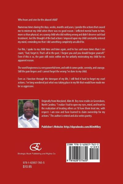 Who hears and cries for the abused child? Numerous times during the days, weeks, months and years, I ponder the actions that caused me to mistreat my child when there was no good reason. I inflicted mental harm to him, more so than physical, on a young child who did nothing wrong and didn't deserve such bad treatment. Just the thought of the bad actions I imposed upon my child constantly entered my mind, reminding me that I did something completely uncalled for. For this, I spoke to my child time and time again, and he has said more times than I can count, "Dad, forget it. That's all in the past. I forgive you and you should forgive yourself." Even if this is so, the pain still exists within me for unfairly mistreating my child for no apparent reason. The word forgiveness is a very powerful term, and with it comes pride, serenity, and courage. Still the pain lingers and I cannot forget the wrong I've done to my child. Even as I function through the timespan of my life, I still find it hard to forget my cruel actions. I've long wondered just what was taking place in my life that would have made me be so aggressive. Originally from Maryland, Alim M. Bey now resides in Greensboro, North Carolina. "I realize I had to open my eyes, mind, and heart to the realization of treating others as I'd have them treat me, with respect. I am now and have learned to claim ownership for my actions." The author is retired and also writes poetry. Publisher's website: http://sbprabooks.com/AlimMBey