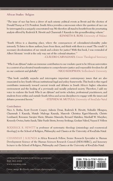 Foreword: Marshall W. Murphree Foreword: Nobuhle Hlongwa Acknowledgements Contributors Introduction: Who is an African? Roderick R. Hewitt Chammah J. Kaunda PART I: RACISM, XENOPHOBIA AND CULTURAL IDENTITY The Changing Salience of Race: Discrimination and Diversity in South Africa Jeremy Seekings, University of Cape Town Cracking the Skull of Racism in South Africa Post-1994 Vuyani S. Vellem, University of Pretoria Black Solidarity Impaled: The Cause of Afrophobia Bernard Matolino, University of KwaZulu-Natal Race, Place and Indian Identities in Contemporary South Africa Goolam Vahed, University of KwaZulu-Natal Ashwin Desai, University of Johannesburg Liberating Identifications: Being Black Conscious, Being Non-Racial, Being African Nico Botha, University of South Africa Umuntu Akalahlwa: An Exploration of an African Ethics Sibusiso Masondo, University of KwaZulu-Natal PART II: GENDER, SEXUALITY AND SOCIAL COHESION "I am Born of a People Who Would Not Tolerat
