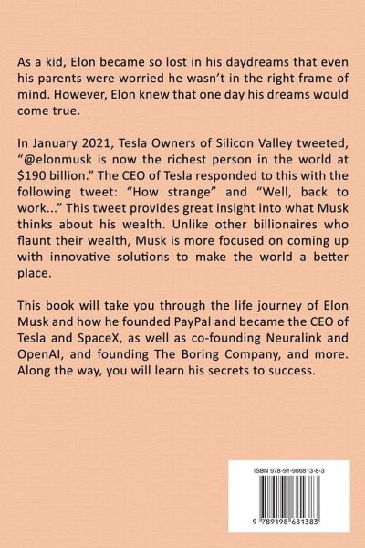 As a kid, Elon became so lost in his daydreams that even his parents were worried he wasn't in the right frame of mind. However, Elon knew that one day his dreams would come true. In January 2021, Tesla Owners of Silicon Valley tweeted, "@elonmusk is now the richest person in the world at $190 billion." The CEO of Tesla responded to this with the following tweet: "How strange" and "Well, back to work..." This tweet provides great insight into what Musk thinks about his wealth. Unlike other billionaires who flaunt their wealth, Musk is more focused on coming up with innovative solutions to make the world a better place. This book will take you through the life journey of Elon Musk and how he founded PayPal and became the CEO of Tesla and SpaceX, as well as co-founding Neuralink and OpenAI, and founding The Boring Company, and more. Along the way, you will learn his secrets to success.
