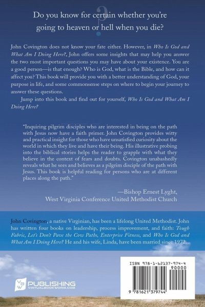 Do you know for certain whether you're going to heaven or hell when you die? John Covington does not know your fate, either. However, in Who Is God and What Am I Doing Here?, John offers some insights that may help you answer the two most important questions you may have about your existence. You are a good person - is that enough? Who is God, what is the Bible, and how can it affect you? This book will provide you with a better understanding of God, your purpose in life, and some commonsense steps on where to begin your journey to answer these questions. Jump into this book and find out for yourself, Who Is God and What Am I Doing Here?