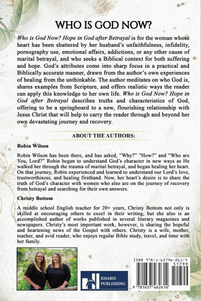 Who is God Now? Hope in God after Betrayal is for the woman whose heart has been shattered by her husband's unfaithfulness, infidelity, pornography use, emotional affairs, addictions, or any other cause of marital betrayal, and who seeks a Biblical context for both suffering and hope. God's attributes come into sharp focus in a practical and biblically accurate manner, drawn from the author's own experiences of healing from the unthinkable. The author meditates on who God is, shares examples from Scripture, and offers realistic ways the reader can apply this knowledge to her own life. Who is God Now? Hope in God after Betrayal describes truths and characteristics of God, offering to be a springboard to a new, flourishing relationship with Jesus Christ that will help to carry the reader through and beyond her own devastating journey and recovery. Endorsement:When Robin Wilson experienced her own personal "D-Day" due to her husband's infidelity, she armed herself with God's Word to fight courageously to save her marriage. Her book chronicles her journey through the highs and lows of remaining faithful to God's calling. A must-read providing hope for those who have endured betrayal.-Josh D. McDowell, author It is refreshing what Robin and Christy have created for women facing the devastating pain of betrayal. Who is God Now? provides genuine hope for healing from betrayal. It also encourages the reader that soul restoration is possible no matter what happens in the relationship. I recommend this book to any woman who wants true healing, abiding peace, and counterintuitive joy that can only come through an honest journey with God.-Jonathan Daugherty, founder of Be Broken Ministries About the Authors:Robin WilsonRobin Wilson has been there, and has asked, "Why?" "How?" and "Who are You, Lord?" Robin began to understand God's character in new ways as He walked her through the trauma of marital betrayal, and began healing her heart. On that journey, Robin experienced and learned to understand our Lord's love, trustworthiness, and healing firsthand. Now, her heart's desire is to share the truth of God's character with women who also are on the journey of recovery from betrayal and searching for their own answers. Christy BottomA middle school English teacher for 20+ years, Christy Bottom not only is skilled at encouraging others to excel in their writing, but she also is an accomplished author of works published in several literary magazines and newspapers. Christy's most important work, however, is sharing the hopeful and heartening news of the Gospel with others. Christy is a wife, mother, teacher, and avid reader, who enjoys regular Bible study, travel, and time with her family.