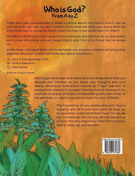 There are many perspectives in today's culture about who God is - and it can be confusing for our kids. Do your children know what the Bible says about God? Do they know how to recognize God's voice? Do they know God's heart for them? The Bible is filled with truths about God's character and His love for us. God wants us to know Him inside and out, beginning to end, from A to Z - just like He knows us. In this book, with each letter of the alphabet, you and your children will enjoy time together discovering what the Bible says about who God is: A - God is the absolute truth B - God is beautiful C - God cares And so much more! Each page has prayer and share sections designed to help you disciple your children as you share your thoughts and your hearts. Whimsical illustrations include an "I Spy" element to capture the interest of younger children. And at the end of the book are 26 prayer prompts, corresponding with each letter of the alphabet, to inspire your own prayers for your children. The foundation of any relationship with God is knowing who He is and how much He loves us. As we better understand God's heart for us, we can increasingly live the way He has wanted us to from the very beginning - filled with peace, hope, joy, and wonder! This book is perfect for: · children aged 7-12 · preteens and tweens · children beginning their faith journey · family devotions · bedtime reading · teachers and parents of elementary school students · Christmas, baptism, confirmation, and birthday gifts · grandparents to pass on a legacy of faith