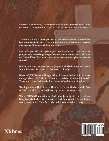 * * * Metusela F. Albert says, "When you know the truth, you will easily know the error(s). But if you don't know the truth, you will not know the error(s)." * * * This book is going to blow your mind with exclusive truth that has been hidden for decades because it was not understood by the mainline Christian (Protestant) Churches and denominations. Read it for yourself and stop being deceived by your own church. You are going to learn something that you had not known before about JESUS in the Old and New Testaments; and his two natures during his incarnation on earth. Did you not know yet that the Almighty God of Abraham did not have a Son in heaven called Jesus? . . . Did you? . . . Really? Of course! JESUS was the Almighty God of Abraham before his incarnation through Mary at Bethlehem. HE alone created the heaven and the earth. There is no other God besides him. None before him and after him. Worship is due to JESUS alone. He was the Father who became the Son of God through Mary at Bethlehem by the incarnation process. While JEHOVAH was in human flesh called Jesus, he did not cease from being God the Father. As an immortal God from eternity, Jesus Christ's divinity cannot die. Therefore, only his humanity died at Calvary.