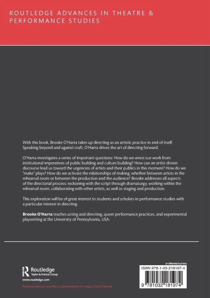 O'Harra investigates a series of important questions: How do we wrest our work from institutional imperatives of public building and culture building? How can an artist-driven discourse lead us toward the urgencies of artists and their publics in this moment? How do we "make" plays? How do we activate the relationships of making, whether between artists in the rehearsal room or between the production and the audience? Brooke addresses all aspects of the directorial process: reckoning with the script through dramaturgy, working within the rehearsal room, collaborating with other artists, as well as staging and production.