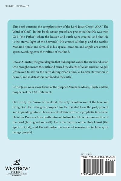This book contains the complete story of the Lord Jesus Christ: AKA "The Word of God." In this book certain proofs are presented that He was with God (the Father) when the heaven and earth were created, and that He is the eternal light of the heaven(s). He created all things and the worlds. Mankind (male and female) is his special creation, and angels are created spirits watching over the welfare of mankind. It was O Lucifer, the great dragon, that old serpent, called the Devil and Satan who brought sin into the earth and caused the deaths of Adam and Eve. Angels left heaven to live on the earth during Noah's time. O Lucifer started war in heaven, and in defeat was confined to the earth. Christ Jesus was a close friend of the prophet Abraham, Moses, Elijah, and the prophets of the Old Testament. He is truly the Savior of mankind, the only begotten son of the true and living God. He is the great prophet, for He revealed to us the past, present and impending future. He came and left this earth on a prophetic time table. He is our Passover from death into everlasting life. He is the resurrection of the dead (both good and evil). He is the baptizer of the Holy Ghost (the Spirit of God), and He will judge the works of mankind to include spirit beings (angels).