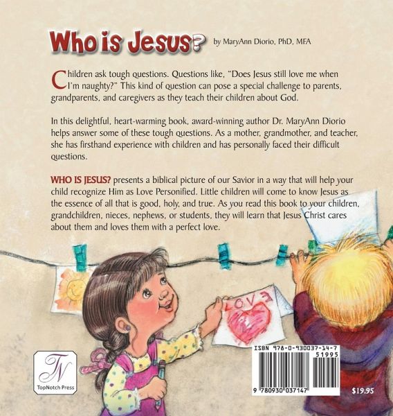WHO IS JESUS? presents a biblical picture of our Savior in a way that will help your child recognize Him as Love Personified. Little children will come to know Jesus as the essence of all that is good, holy, and true. As you read this book to your children, grandchildren, nieces, nephews, or students, the will learn that Jesus Christ cares about them and loves them with a perfect love.