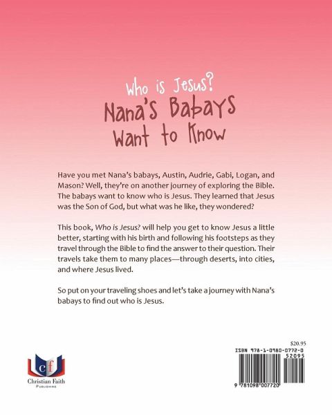 Have you met Nana's babays, Austin, Audrie, Gabi, Logan, and Mason? Well, they're on another journey of exploring the Bible. The babays want to know who is Jesus. They learned that Jesus was the Son of God, but what was he like, they wondered? This book, Who is Jesus? will help you get to know Jesus a little better, starting with his birth and following his footsteps as they travel through the Bible to find the answer to their question. Their travels take them to many places—through deserts, into cities, and where Jesus lived. So put on your traveling shoes and let's take a journey with Nana's babays to find out who is Jesus.