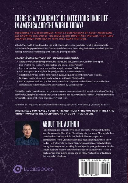 In the first chapter, the author draws our attention to his impetus in writing the book - the state of unbelief in God in America today. He says there is a pandemic of infectious unbelief in America and the world today! According to a 2020 survey, ninety-four percent of adult Americans say knowing the God of the Bible is not important. Instead, they have created their own idea of who they want Him to be. So where have you placed your faith and trust? Find out now if they are firmly rooted in the solid ground of the Bible and God's true nature. Read more Who Is This God? A Handbook for Life with Him is a Christian nonfiction book that unravels the confusion to help people discover God's nature and character. In so doing, it demonstrates how you can develop a personal relationship with Him and grow spiritually. Major themes about God and life with Him include:There is one God in three persons, the Father, the Son, Jesus Christ, and the Holy Spirit. God created you to experience His love and know Him personally. Everyone needs to be rescued and born-again to enter His Heaven. God has a purpose and plans for you (your life is not meaningless). The Holy Spirit was sent to dwell within, guide, help, and teach the followers of Jesus. Believers must mature spiritually to live an authentic Christian life. God is supernatural, and you live in the natural and supernatural realms of this world where miracles and other supernatural interventions by God still occur. Embedded in the forty-three chapter narratives are nearly three hundred questions, six hundred and sixty scripture quotations, and seventy true stories. These stories include miracles of healing, deliverance, and protection only the God of the Bible can do. You will also see that God communicates through His Spirit with those who sincerely seek Him.