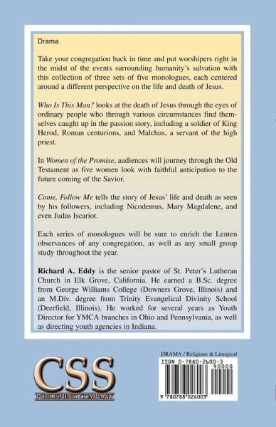 Take your congregation back in time and put worshipers right in the midst of the events surrounding humanity's salvation with this collection of three sets of five monologues, each centered around a different perspective on the life and death of Jesus. Who Is This Man? looks at the death of Jesus through the eyes of ordinary people who through various circumstances find themselves caught up in the passion story, including a soldier of King Herod, Roman centurions, and Malchus, a servant of the high priest. In Women of the Promise, audiences will journey through the Old Testament as five women look with faithful anticipation to the future coming of the Savior. Come, Follow Me tells the story of Jesus' life and death as seen by his followers, including Nicodemus, Mary Magdalene, and even Judas Iscariot. Each series of monologues will be sure to enrich the Lenten observances of any congregation, as well as any small group study throughout the year.