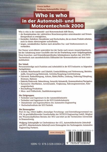 Das AZT/MTZ-Taschenbuch enthält aktuelle und verlässliche Anschriften, Telefon- und Faxnummern und hilft dabei, · die Kontaktnahme der zahlreichen Branchenexperten untereinander und firmenübergreifend zu ermöglichen, · Hersteller, Zulieferer, Dienstleister und Hochschulen, die an einem Produkt arbeiten, auch in einem Adressregister aufzufinden · langes, umständliches Suchen nach aktuellen FAX- und Telefonnummern zu vermeiden. Der Nutzer wird dabei effektiv unterstützt bei der Suche nach neuen Ansprechpartnern, bei der Anbahnung neuer Geschäfte oder bei der Erarbeitung neuer Aufgabengebiete. Diese branchen- und firmenübergreifenden Informationen machen das ATZ/MTZ-Taschenbuch zum unentbehrlichen Hilfsmittel der Kommunikation auf dem Automobilsektor.