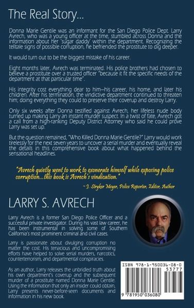 Donna Marie Gentile was an informant for the San Diego Police Dept. Larry Avrech, who was a young officer at the time, stumbled across Donna and the information about her 'sugar daddy' within the department. Recognizing the telltale signs of possible corruption, he befriended the prostitute to dig deeper. It would turn out to be the biggest mistake of his career. Eight months later, Avrech was terminated. His police brothers had chosen to believe a prostitute over a trusted officer "because it fit the specific needs of the department at that particular time". His integrity cost everything dear to him-his career, his home, and later his children. After his termination, the vindictive department continued to threaten him; doing everything they could to preserve their cover up and destroy Larry. Only six weeks after Donna testified against Avrech, her lifeless nude body turned up making Larry an instant murder suspect. In a twist of fate, Avrech got a call from a high-ranking Deputy District Attorney who said he could prove Larry was set up. But the question remained, "Who Killed Donna Marie Gentile?" Larry would work tirelessly for the next seven years to uncover a serial murder and eventually reveal the details in this comprehensive book about what happened behind the sensational headlines.