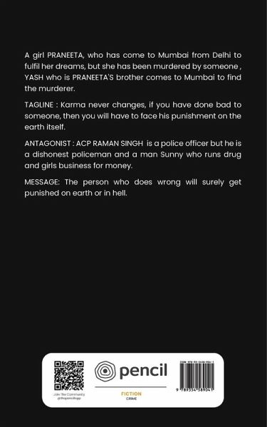 A girl PRANEETA, who has come to Mumbai from Delhi to fulfil her dreams, but she has been murdered by someone , YASH who is PRANEETA'S brother comes to Mumbai to find the murderer. TAGLINE : Karma never changes, if you have done bad to someone, then you will have to face his punishment on the earth itself. ANTAGONIST : ACP RAMAN SINGH is a police officer but he is a dishonest policeman and a man Sunny who runs drug and girls business for money. MASSAGE: The person who does wrong will surely get punished on earth or in hell.