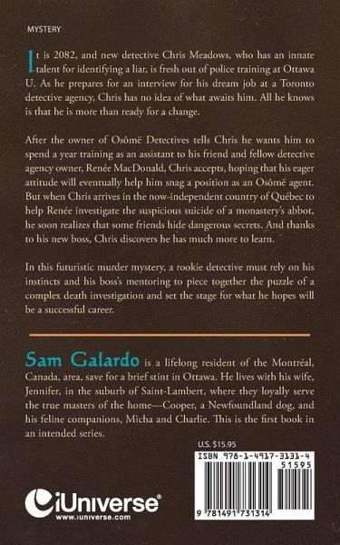 It is 2082, and new detective Chris Meadows, who has an innate talent for identifying a liar, is fresh out of police training at Ottawa U. As he prepares for an interview for his dream job at a Toronto detective agency, Chris has no idea of what awaits him. All he knows is that he is more than ready for a change. After the owner of Osômë Detectives tells Chris he wants him to spend a year training as an assistant to his friend and fellow detective agency owner, Renée MacDonald, Chris accepts, hoping that his eager attitude will eventually help him snag a position as an Osômë agent. But when Chris arrives in the now-independent country of Québec to help Renée investigate the suspicious suicide of a monastery's abbot, he soon realizes that some friends hide dangerous secrets. And thanks to his new boss, Chris discovers he has much more to learn. In this futuristic murder mystery, a rookie detective must rely on his instincts and his boss's mentoring to piece together the puzzle of a complex death investigation and set the stage for what he hopes will be a successful career.