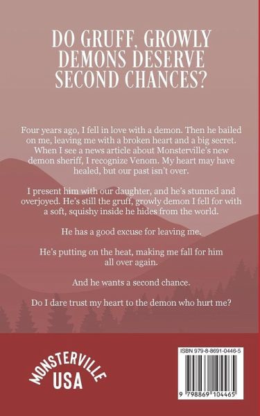 Do gruff, growly demons deserve second chances? Four years ago, I fell in love with a demon. Then he bailed on me, leaving me with a broken heart and a big secret. When I see a news article about Monsterville's new demon sheriff, I recognize Venom. My heart may have healed, but our past isn't over. I present him with our daughter, and he's stunned and overjoyed. He's still the gruff, growly demon I fell for with a soft, squishy inside he hides from the world. He has a good excuse for leaving me. He's putting on the heat, making me fall for him all over again. And he wants a second chance. Do I dare trust my heart to the demon who hurt me?