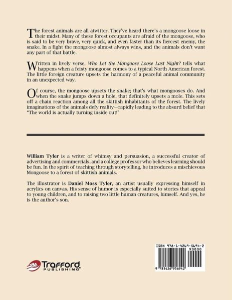 The forest animals are all atwitter. They've heard there's a mongoose loose in their midst. Many of these forest occupants are afraid of the mongoose, who is said to be very brave, very quick, and even faster than its fiercest enemy, the snake. In a fight the mongoose almost always wins, and the animals don't want any part of that battle. Written in lively verse, Who Let the Mongoose Loose Last Night? tells what happens when a feisty mongoose comes to a typical North American forest. The little foreign creature upsets the harmony of a peaceful animal community in an unexpected way. Of course, the mongoose upsets the snake; that's what mongooses do. And when the snake jumps down a hole, that definitely upsets a mole. This sets off a chain reaction among all the skittish inhabitants of the forest. The lively imaginations of the animals defy reality-rapidly leading to the absurd belief that "The world is actually turning inside out!"