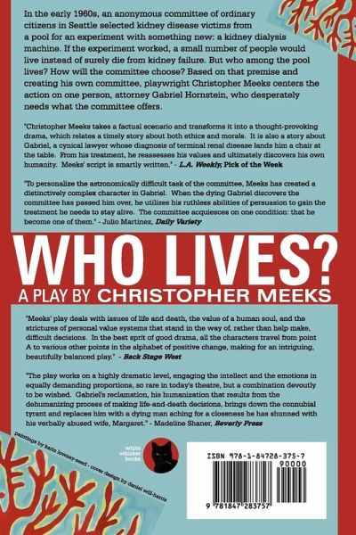 In the early 1960s, an anonymous committee of ordinary citizens in Seattle debated over which kidney disease victims to choose for an experiment with something new: a kidney dialysis machine. If the experiment worked, a small number of people would live instead of surely die from kidney failure. But who among the selection pool lives? How will the committee choose? Based on that premise and creating his own committee, playwright Christopher Meeks centers the action on one person, attorney Gabriel Hornstein, who desperately needs what the committee offers. In a review of the play in Los Angeles, the LA Weekly wrote, "Christopher Meeks takes this factual scenario and transforms it into a thought-provoking drama, which relates a timely story about both ethics and morals.... Meeks' script is smartly written."