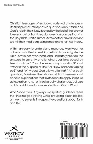 Christian teenagers often face a variety of challenges in life that prompt introspective questions about faith and God's role in their lives. Buoyed by the belief the answer to every spiritual and secular question can be found in the Holy Bible, Portia Turner Merriweather asked teens to submit their most perplexing questions to test her theory. Within an easy-to-understand resource, Merriweather utilizes a modified scientific method to investigate the Bible, prove her hypothesis, and ultimately provide the answers to seventy challenging questions posed by teens such as "Can I be sure of my salvation?" and "What is the purpose of life?" or "How bad can vaping be?" and "Why does God allow suffering?" After each question, Merriweather shares biblical answers and concise explanations that invite teens to apply scripture as inspiration to not only solve daily challenges, but also build a solid foundation created from God's Word. Who Made God, Anyway? is a spiritual guide for teens that inspires godly living while providing clear, biblical answers to seventy introspective questions about faith and life.