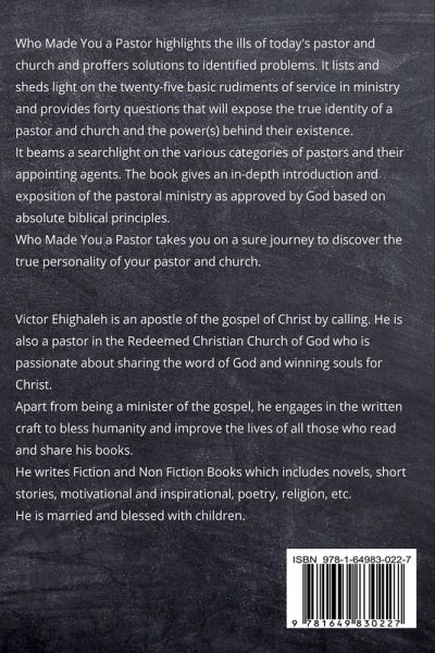 Who Made You a Pastor highlights the ills of today's pastor and church and proffers solutions to identified problems. It lists and sheds light on the twenty-five basic rudiments of service in ministry and provides forty questions that will expose the true identity of a pastor and church and the power(s) behind their existence. It beams a searchlight on the various categories of pastors and their appointing agents. The book gives an in-depth introduction and exposition of the pastoral ministry as approved by God based on absolute biblical principles. Who Made You a Pastor takes you on a sure journey to discover the true personality of your pastor and church. The book comprehensively provides a compass to enable you make the appropriate decision whether to abide with your pastor and church or exit them for a better alternative towards making you a true worshipper.