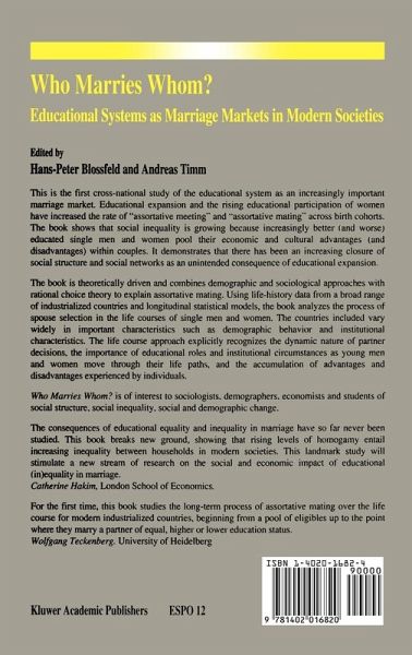 "The rising enrollment in higher education, especially of women, has not only led to a postponement of marriage but also increased the importance of the educational system as a place to meet and find a (marriage) partner. Since education is the most influential factor for peoples' later job careers and income attainment, increasing rates of educational assortative mating leads to a wider spread in households' income distribution. For the first time, this book studies the long-term process of assortative mating over the life course for thirteen modern industrialized countries, beginning from a pool of eligibles up to the point where they marry a partner of equal, higher or lower educational status.With increasing duration in school, the rate of homogenous marriages rises, and after the transition from school to work more heterogonous environments account for the fact of less homogeneity in later marriages. The book also shows that social origin matters especially for women: In most countries educationally upward mobile women are very likely to marry downward. The changing role of the educational system as a marriage market in the course of educational expansion and women's changing economic roles in the labor market and the family are the main driving forces behind this development. Using event history methods, the book compares the processes of assortative mating in the various European societies, in Israel and the USA, and points out communalities and differences in the mechanisms."