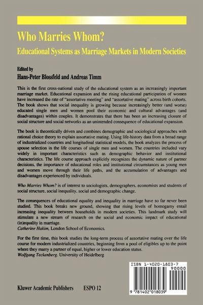 "The rising enrollment in higher education, especially of women, has not only led to a postponement of marriage but also increased the importance of the educational system as a place to meet and find a (marriage) partner. Since education is the most influential factor for peoples' later job careers and income attainment, increasing rates of educational assortative mating leads to a wider spread in households' income distribution. For the first time, this book studies the long-term process of assortative mating over the life course for thirteen modern industrialized countries, beginning from a pool of eligibles up to the point where they marry a partner of equal, higher or lower educational status.With increasing duration in school, the rate of homogenous marriages rises, and after the transition from school to work more heterogonous environments account for the fact of less homogeneity in later marriages. The book also shows that social origin matters especially for women: In most countries educationally upward mobile women are very likely to marry downward. The changing role of the educational system as a marriage market in the course of educational expansion and women's changing economic roles in the labor market and the family are the main driving forces behind this development. Using event history methods, the book compares the processes of assortative mating in the various European societies, in Israel and the USA, and points out communalities and differences in the mechanisms."