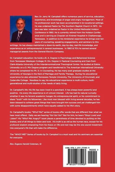 The "Who? Me!" series of books offer words that are different than what we hear most often. Daily we are hearing "Go! Go! Go!", but for Dr. Campbell, he hears "Stop! Look! and Listen!" His "Who? Me! Angry?" book places a parenthesis of time devoted to putting on the brakes and of all things to stop, look and listen. His truth is as old as the human race, except for his profound wisdom emanating from his thesis on life and anger which may be the one sound investment into everyone's life that will make the difference.