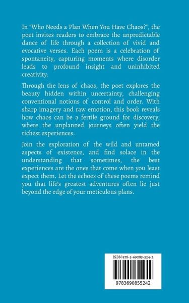 In "Who Needs a Plan When You Have Chaos?", the poet invites readers to embrace the unpredictable dance of life through a collection of vivid and evocative verses. Each poem is a celebration of spontaneity, capturing moments where disorder leads to profound insight and uninhibited creativity. Through the lens of chaos, the poet explores the beauty hidden within uncertainty, challenging conventional notions of control and order. With sharp imagery and raw emotion, this book reveals how chaos can be a fertile ground for discovery, where the unplanned journeys often yield the richest experiences. Join the exploration of the wild and untamed aspects of existence, and find solace in the understanding that sometimes, the best experiences are the ones that come when you least expect them. Let the echoes of these poems remind you that life's greatest adventures often lie just beyond the edge of your meticulous plans.