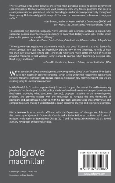 "Pierre Lemieux once again debunks one of the most pervasive delusions driving government economic policy. His lucid writing and vivid examples show why federal programs that seek to create jobs are almost guaranteed to breed boondoggles and undermine productivity throughout the economy. Unfortunately, politicians profit from such schemes no matter how much taxpayers suffer." - Jim Bovard, author of Attention Deficit Democracy (2006) and Lost Rights: The Destruction of American Liberty (1994)