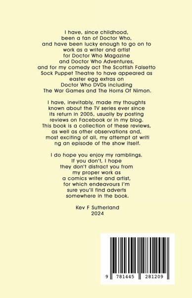 The Complete Doctor Who Television Reviews of Kev F Sutherland I have, since childhood, been a fan of Doctor Who, and have been lucky enough to go on to work as a writer and artist for Doctor Who Magazine and Doctor Who Adventures, and for my comedy act The Scottish Falsetto Sock Puppet Theatre to have appeared as easter egg extras on Doctor Who DVDs including The War Games and The Horns Of Nimon. I have, inevitably, made my thoughts known about the TV series ever since its return in 2005, usually by posting reviews on Facebook or in my blog. This book is a collection of these reviews, as well as other observations and, most exciting of all, my attempt at writing an episode of the show itself. I do hope you enjoy my ramblings. If you don't, I hope they don't distract you from my proper work as a comics writer and artist, for which endeavours I'm sure you'll find adverts somewhere in the book. Kev F Sutherland Previous reviews for Kev F's comic books: "...really smart & clever... seamless riffing from high Shakespeare to low demotic." - Martin Rowson (on Prince Of Denmark Street) "A clever way in to Shakespeare. Recommend." - Anna, Etsy "I normally stay away from Shakespeare works but not this enjoyable and funny" - Debbie, Amazon "What an amazing and imaginative spin on a Shakespeare classic. Highly recommended!!!" - Chris R, Amazon "A genuine page-turner with more twists and turns than a contortionist playing twister on the Hampton Court Palace Maze schematics after downing a dozen Red Bulls. Highly recommended!" - Laurence, Amazon "Another brilliant book from Kev. He brings Shakespeare to life in a new, fun and interesting way - updated for the 21st century in his own unique way. I love his books!!" - Pixies & Me, Etsy
