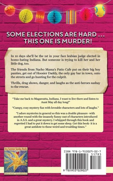 All Elections are hard... This one is Murder In 10 days she'll be the 1st in your face lesbian judge elected in homo-hating Indiana. But someone is trying to kill her and her little dog, too. The friends from Nacho Mama's Patio Cafe put on their big boy panties, get out of the gay bar, onto the streets of the small Indiana college townand go hunting for the culprit. Thrills, drag shows, and laughs as the krewe of anti-heroes sashay to the rescue.